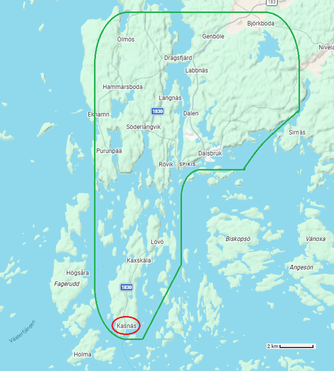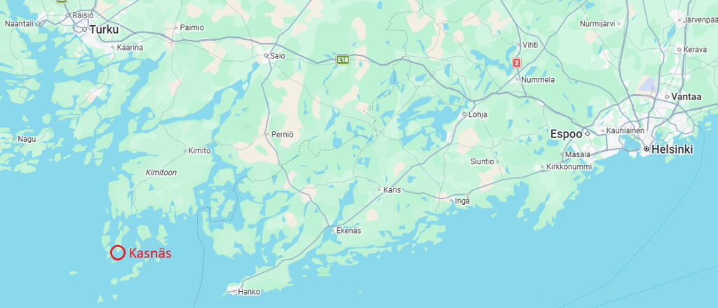 Kasnäs is located at the southern tip of the large island of Kemiö, on Finland’s south coast. It’s about 180 km west of Helsinki and around 100 km south-east of Turku.